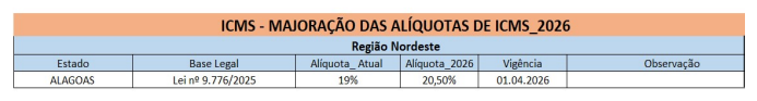 O Estado de Alagoas, majorou a alíquota de ICMS aplicável nas operações internas a partir de01.04.2026, conforme disposto na Lei nº 9776/2025.
